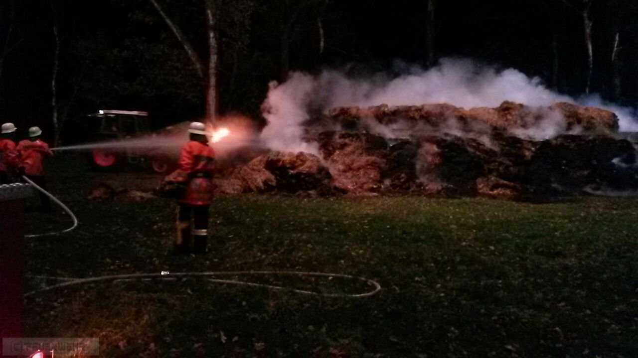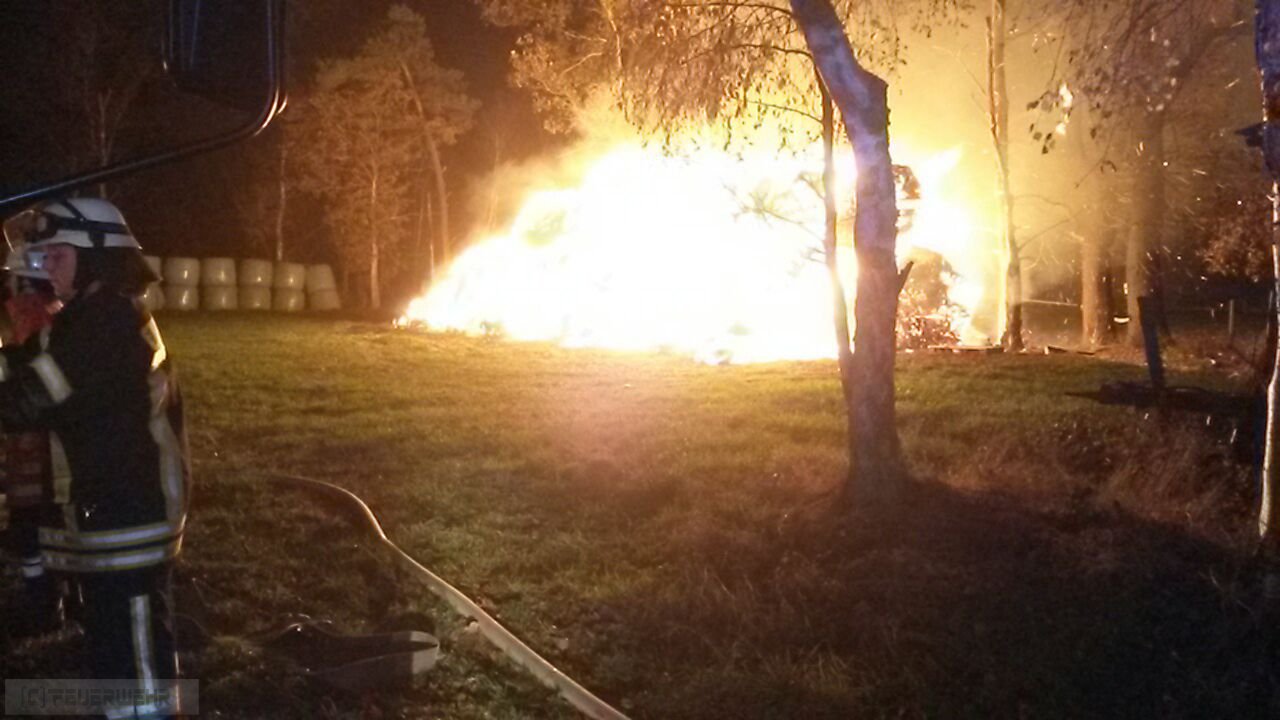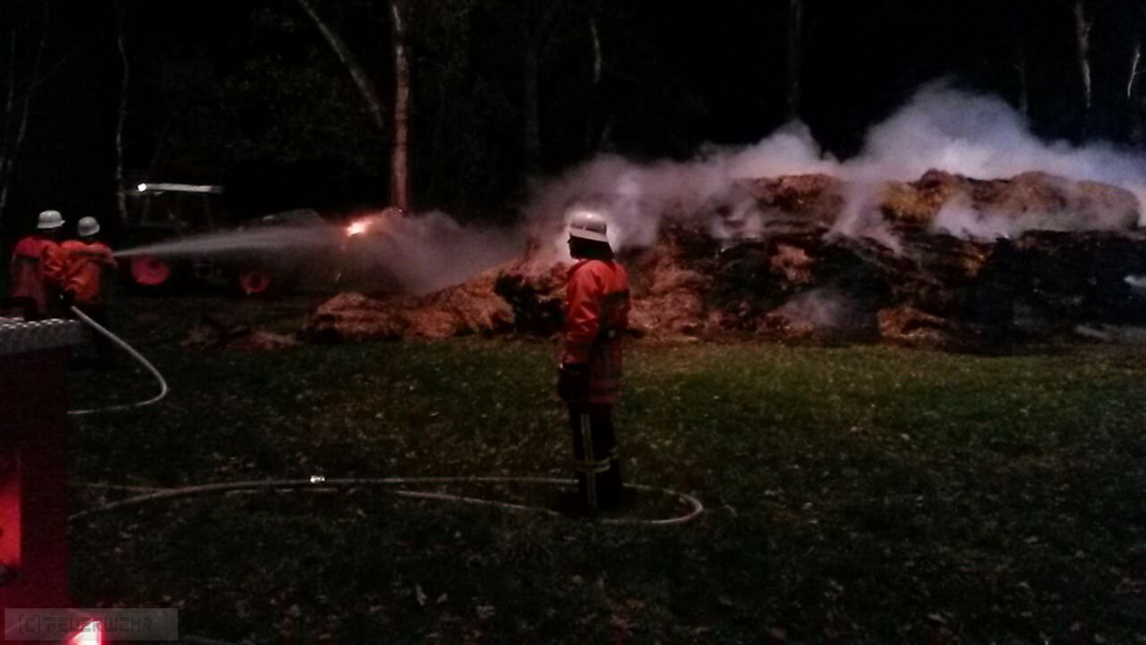 Steddorf(tw) Alarmfür die Ortsfeuerwehren aus Zeven,Heeslingen und Boitzen sowie dem Gemeindebrandmeister Zeven am 16.11.14 um 03:51 Uhr zu einem Feuer zwischen Boitzen und Steddorf,laut Meldung der Rettungsleitstelle solle abseits der L 124 zwischen Boitzen und Steddorf ein Schuppen brennen. Gemäß AAO ist die Ortsfeuerwehr Zeven mit Drehleiter und Löschgruppenfahrzeug 16/12 nach Boitzen ausgerückt. Nach Eintreffen der ersten Kräfte wurde festgestellt, dass nicht ein Schuppen sondern ca. 120 Großballen Stroh in Vollbrand standen. Sofort wurden eine Löschwasserversorgung durch die Ortsfeuerwehr Boitzen aufgebaut, welche das Tanklöschfahrzeug aus Heeslingen speißen sollte. Mit Unterstützung der Drehleiter wurden die brennenden Strohballen abgelöscht. Zur weiteren Unterstützung ließ der Gemeindebrandmeister noch die Ortsfeuerwehr Steddorf nachalarmieren. Mit Unterstützung von Radladern wurde das Stroh auseinander gezogen um das Stroh gezielt ablöschen zu können.