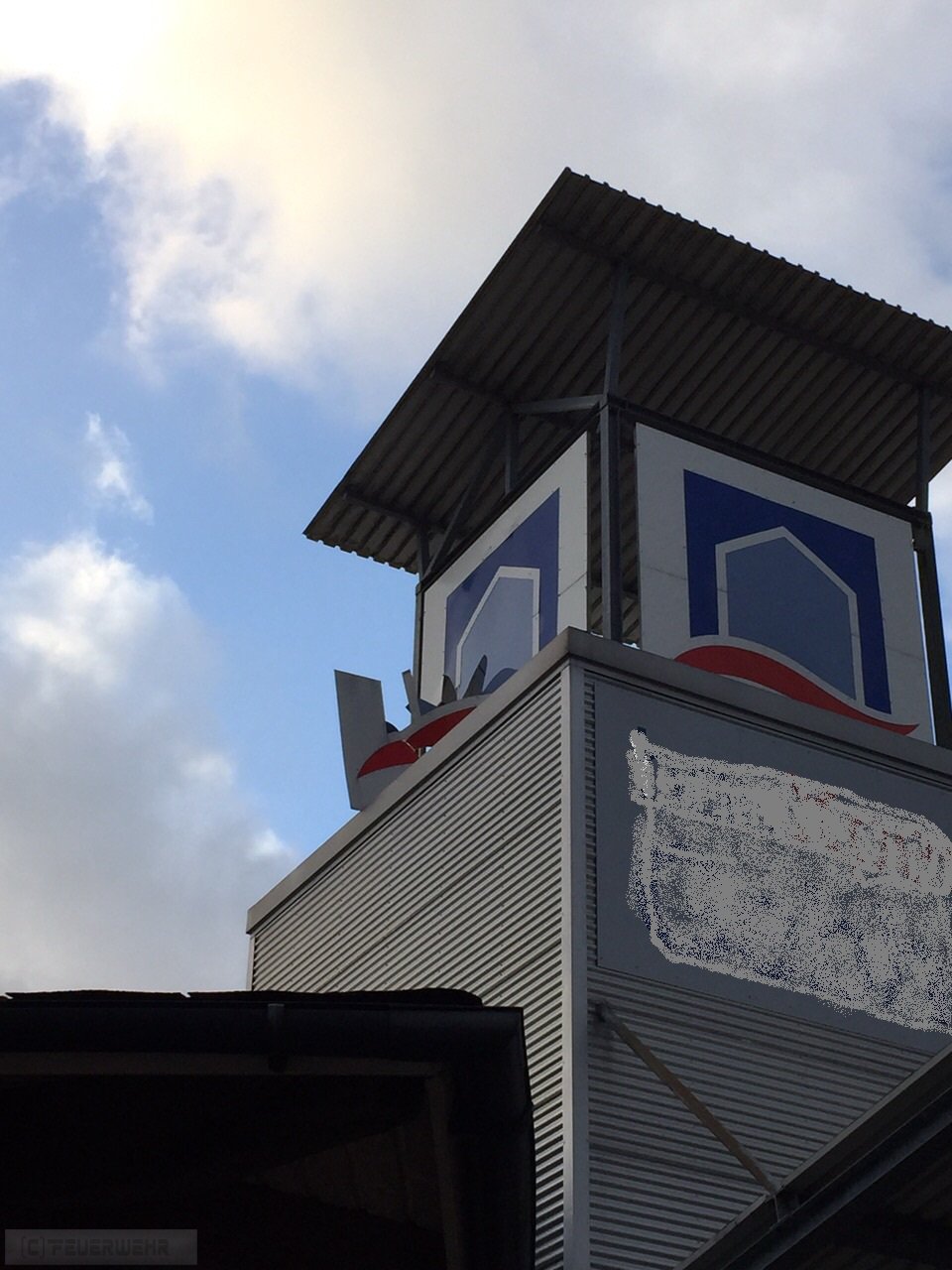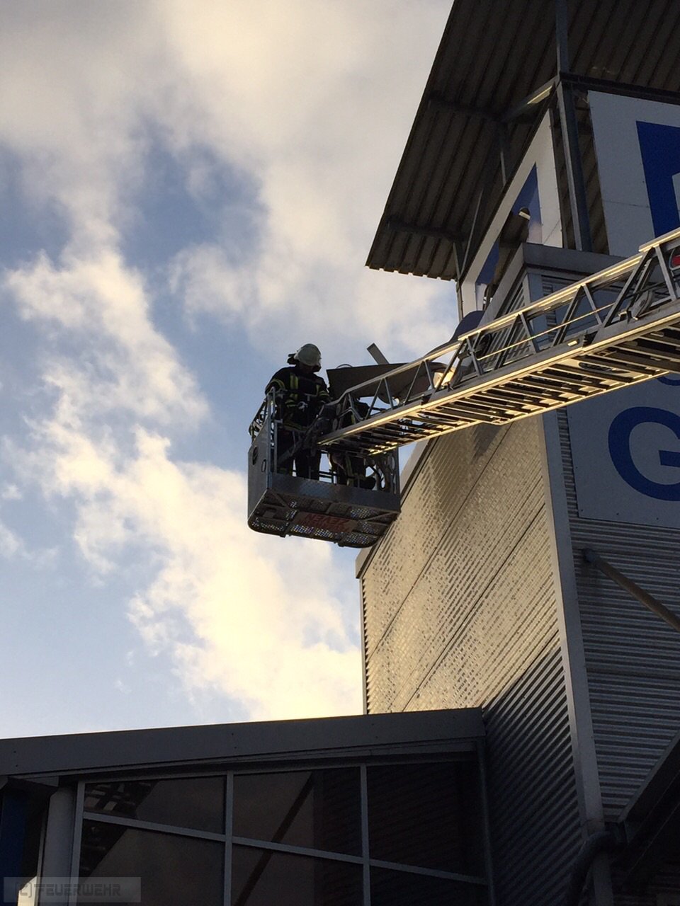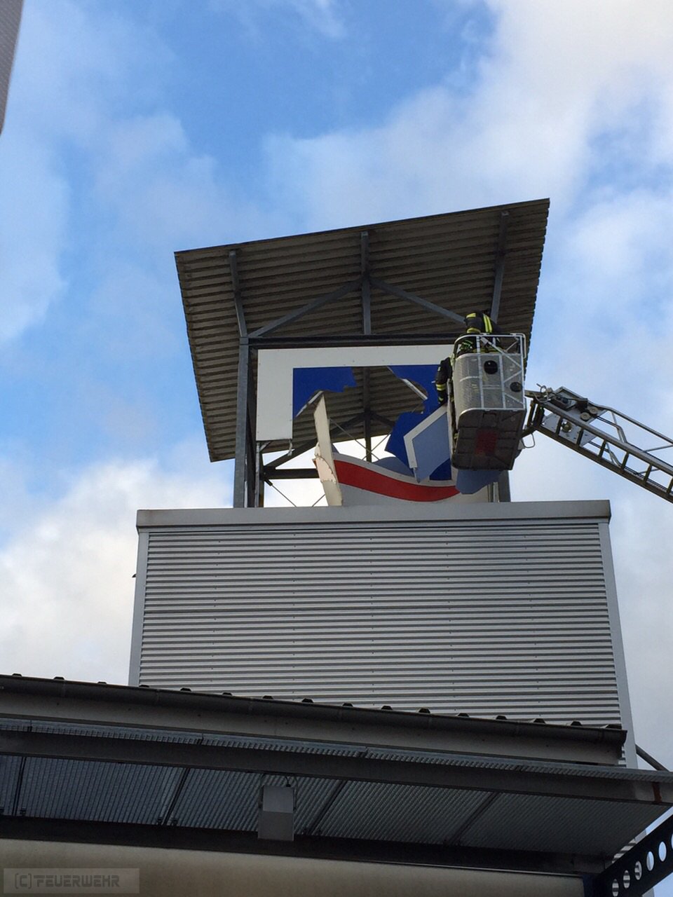 Es drohte ein Werbebanner aus größer Höhe auf die Straße zu fallen, mit Unterstützung der Drehleiter wurde ein Teil des Werbebanners entfernt.