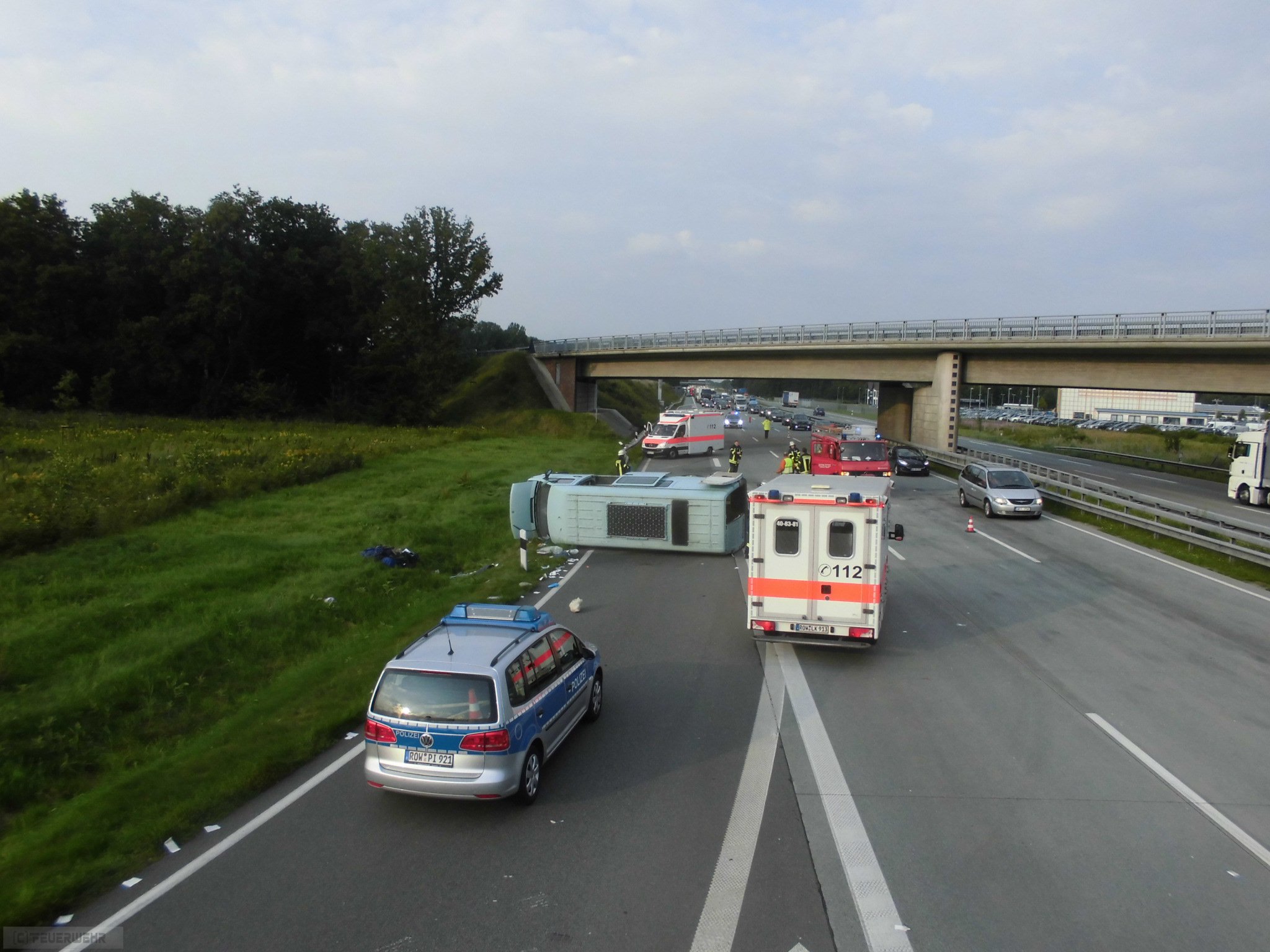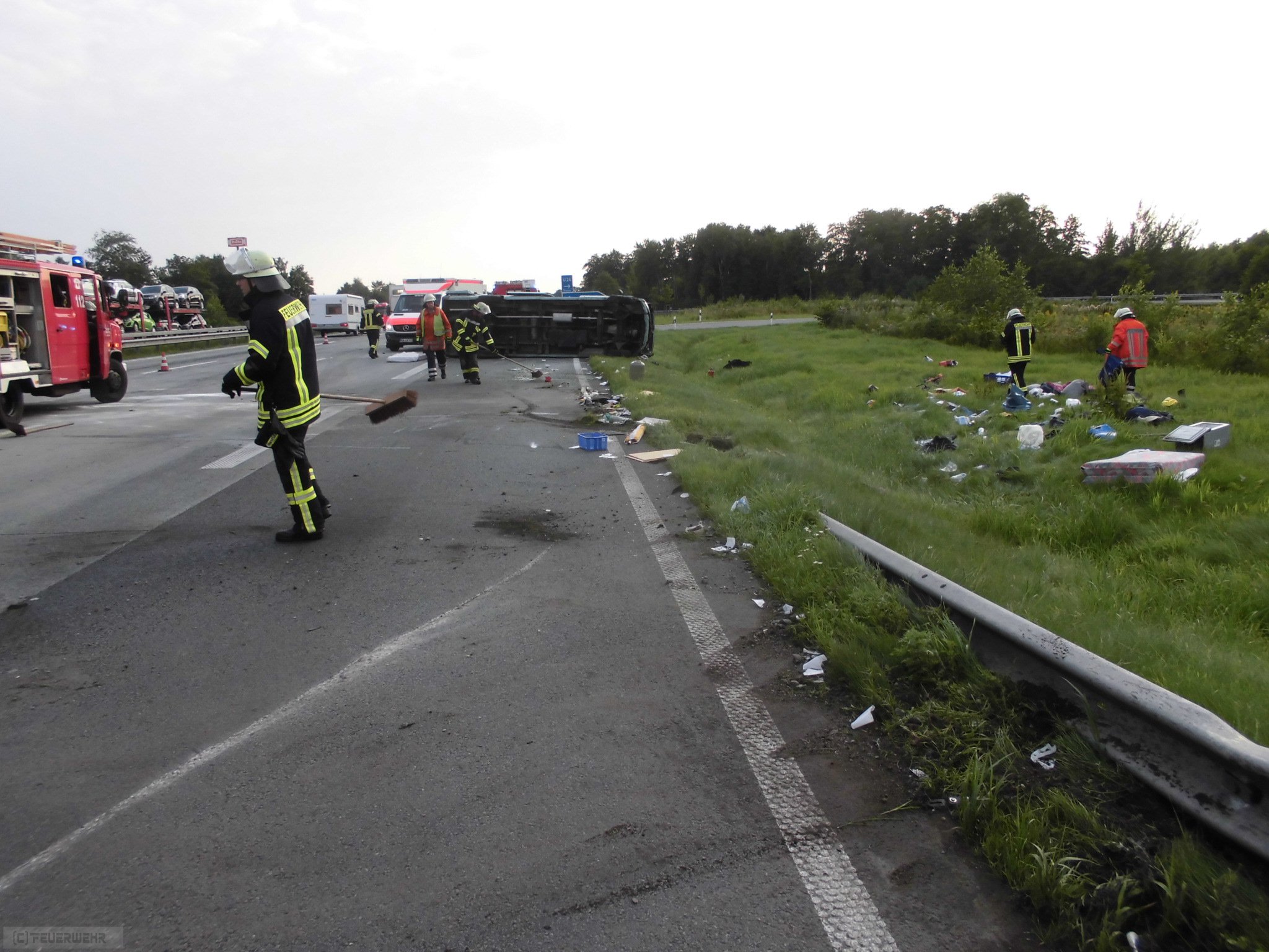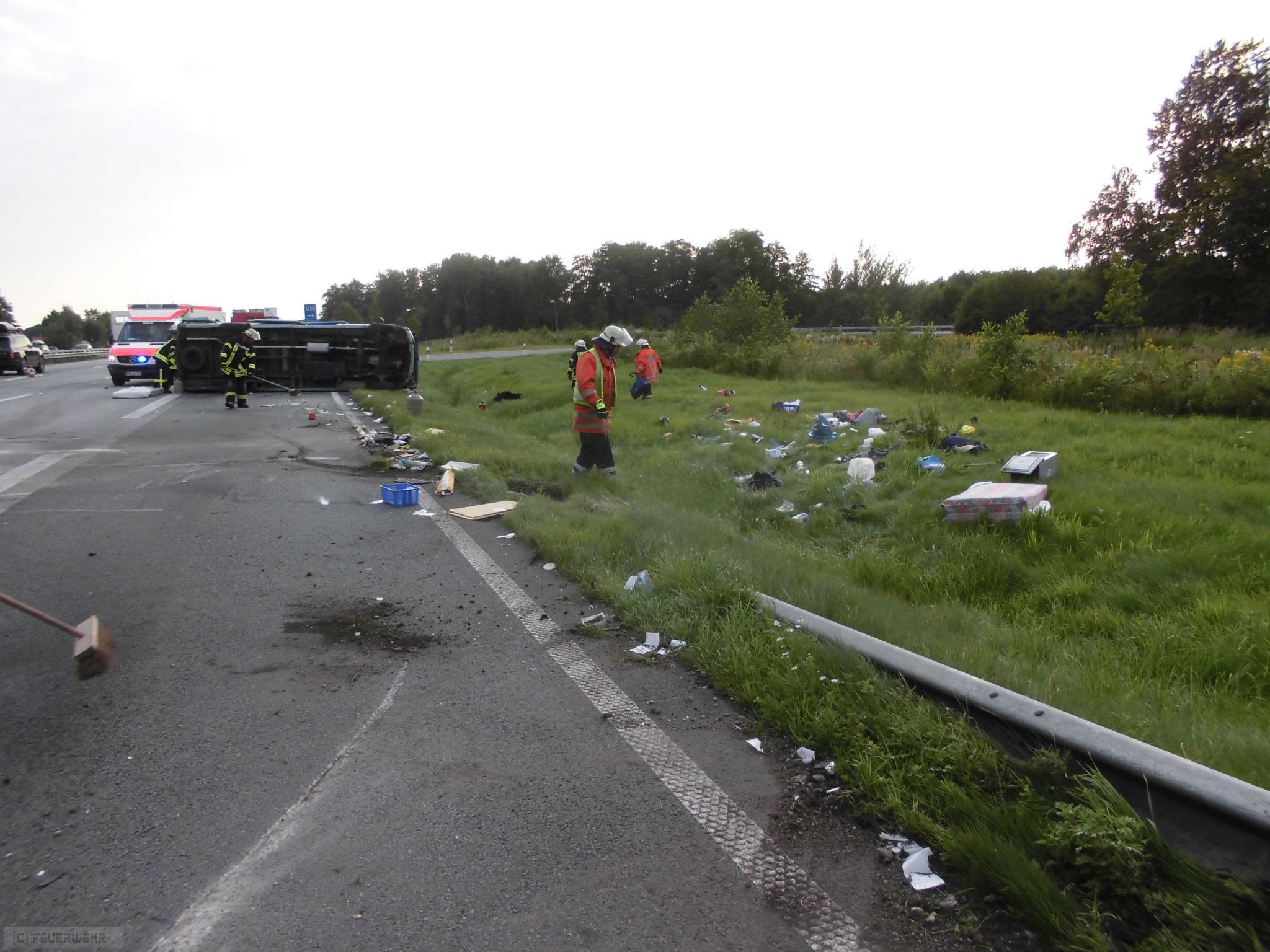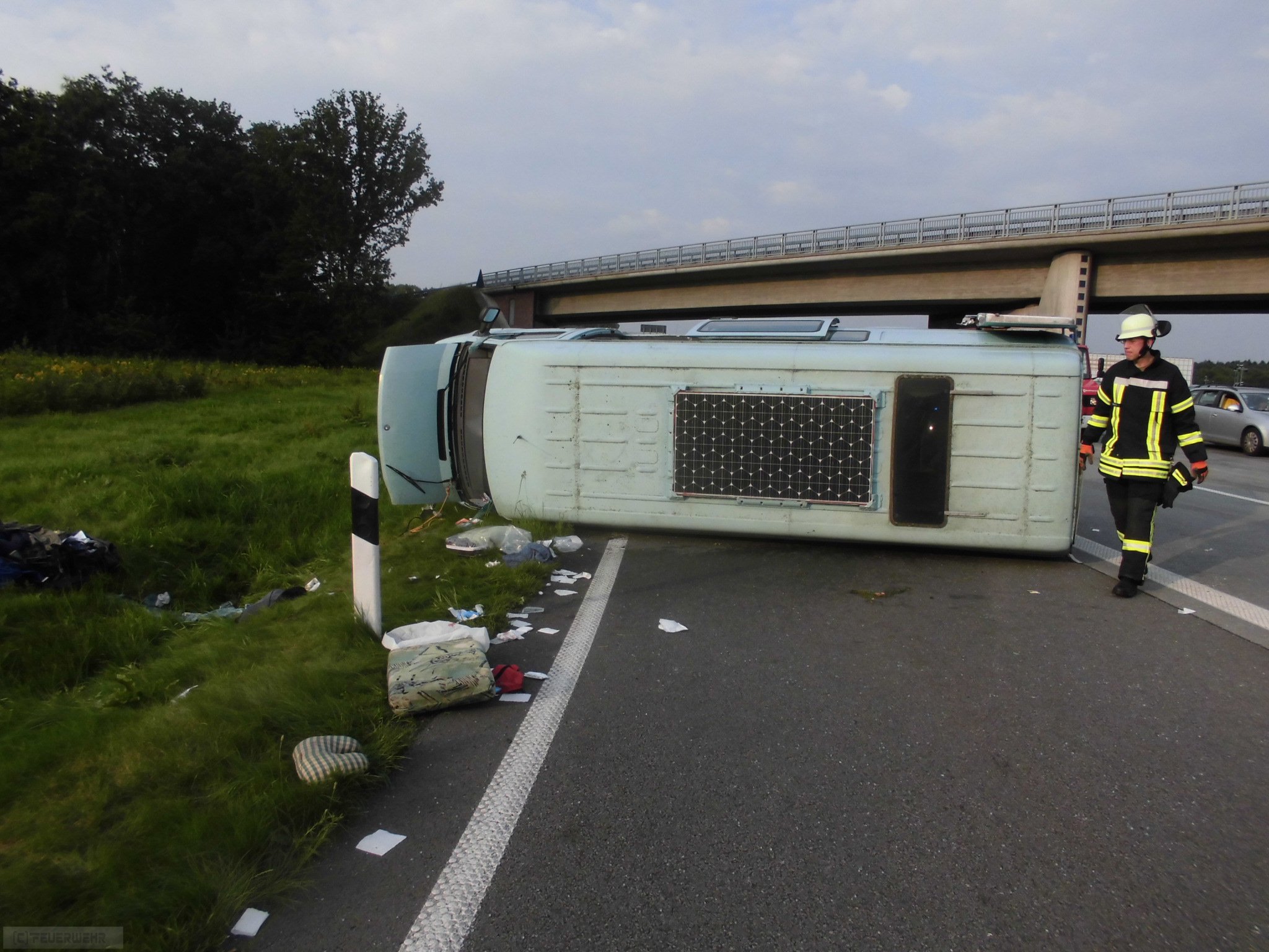 Ein weiterer Reifendefekt sorgte gegen 18:00 Uhr für den Einsatz mehrerer Rettungswagen sowie der Feuerwehren aus Elsdorf und Zeven. Im Bereich der Anschlusstelle Bockel geriet ein Wohnmobil aus Bremen, aufgrund eines geplatzten Hinterrades, ins Schleudern und kippte auf die Seite. Die beiden Insassen, eine 31-jährige Fahrerin und ihr 41-jähriger Beifahrer aus Frankreich, zogen sich dabei diverse Verletzungen zu und mussten durch die alarmierte Feuerwehr aus dem Fahrzeug befreit werden. Für die Bergungsmaßnahmen musste die Fahrbahn teilweise gesperrt werden,sodass sich ein Rückstau von etwa 5 Kilometern länge bildete.