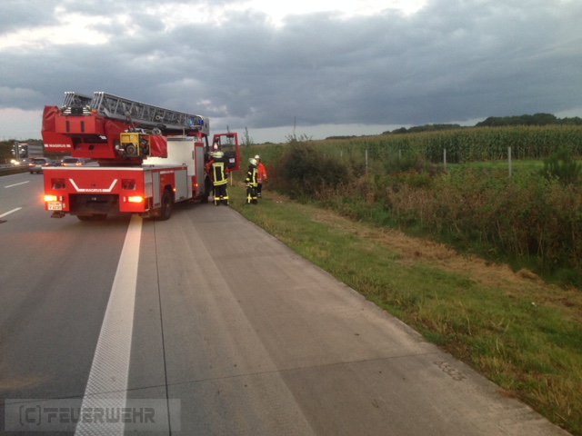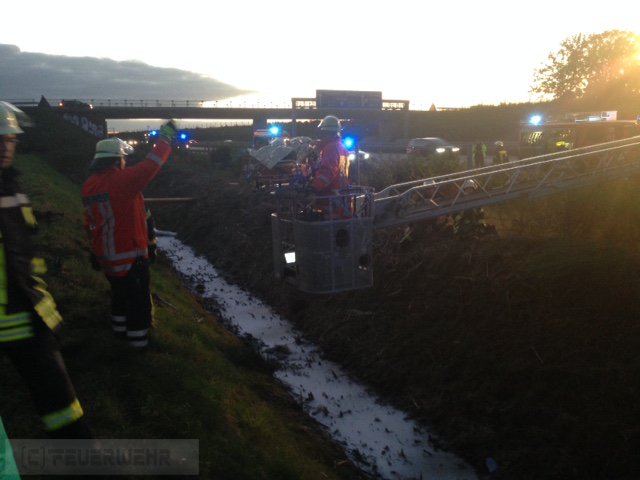 Elsdorf(tw) Alarm für die Ortsfeuerwehren aus Elsdorf und Zeven sowie dem Rettungsdienst aus Zeven zu einem schwerden Verkehrsunfall auf der Autobahn A1 in Fahrtrichtung Hamburg bei Kilometer 65,5 am 27.09.15 um 18.54 Uhr. Laut ersten Meldungen sollte eine Person in dem verunfallten PKW eingeklemmt sein. Kurz vor Ausfahrt des ersten Fahrzeuges kam auf die DME die Meldung A-B-S-P-A-N-N-E-N laut Autobahnpolizei keine Person mehr im Fahrzeug eingeklemmt. Kurze Zeit später wurden die DME erneut ausgelöst, es wird jetzt doch die Feuerwehr zur technischen Rettung benötigt. Da das Fahrzeug von der Fahrbahn abgekommen war,einen Wildschutzzaun durchbrochen hat und in einem Entwässerungsgraben zum liegen gekommen ist und die Person durch Ersthelfer befreit worden ist, aber allerdings auf einer Wiese gelegen hat, musste die Person mittels Drehleiter von der Wiese zurück auf die Autobahn geholt werden. Nachdem die Person an den Rettungsdienst übergeben worden ist, wurde noch eine Ölsperre gesetzt und auslaufende Betriebsstoffe gebunden.