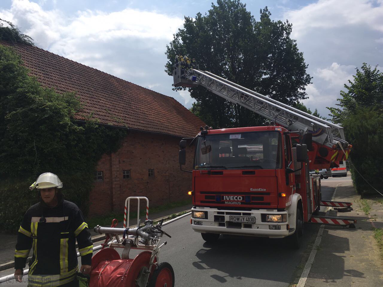 Zeven(tw) Alarm für die Ortsfeuerwehr Zeven am 07.08.17 um 12:02 Uhr uzu einem gemeldeten Scheuenbrand auf einem leer stehenden Bauernhof mitten in Zeven. Nach Eintreffen der ersten kräfte konnte das Feuer zügig bekämpft werden, sodas kein größerer Schaden entstanden ist. In der Scheune brannte noch altes Stroh, die Polizei Zeven hat die Ermittlung zur Brandursache aufgenommen.