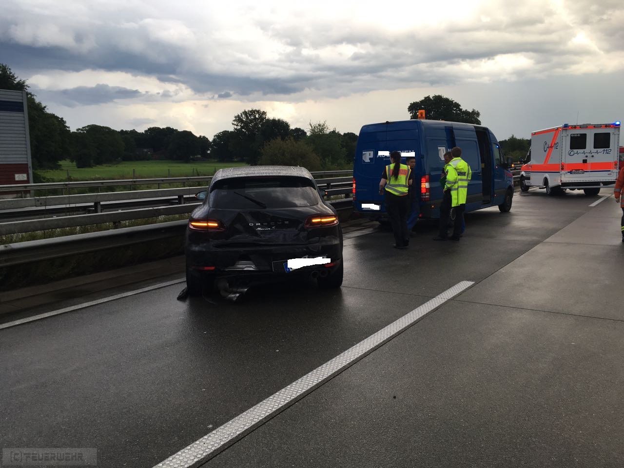 Elsdorf/A1. Durch den Starkregen am Dienstagabend bildeten sich auch auf der Hansalinie zwischen Bremen und Hamburg größere Wasserflächen und sorgten für Aquaplaning. Auf der Richtungfahrbahn Hamburg verlor die 46-jährige Fahrerin eines Porsche gegen 19.20 Uhr die Kontrolle über ihr Fahrzeug. Der Wagen geriet ins Schleudern, prallte in die Mittelschutzplanke und kollidierte mit dem Fiat eines 66-jährigen Autofahrers aus Schweden. Beide Unfallbeteiligten zogen sich leichte Verletzungen zu. Die Polizei geht von einem Sachschaden in Höhe von 30.000 Euro aus.