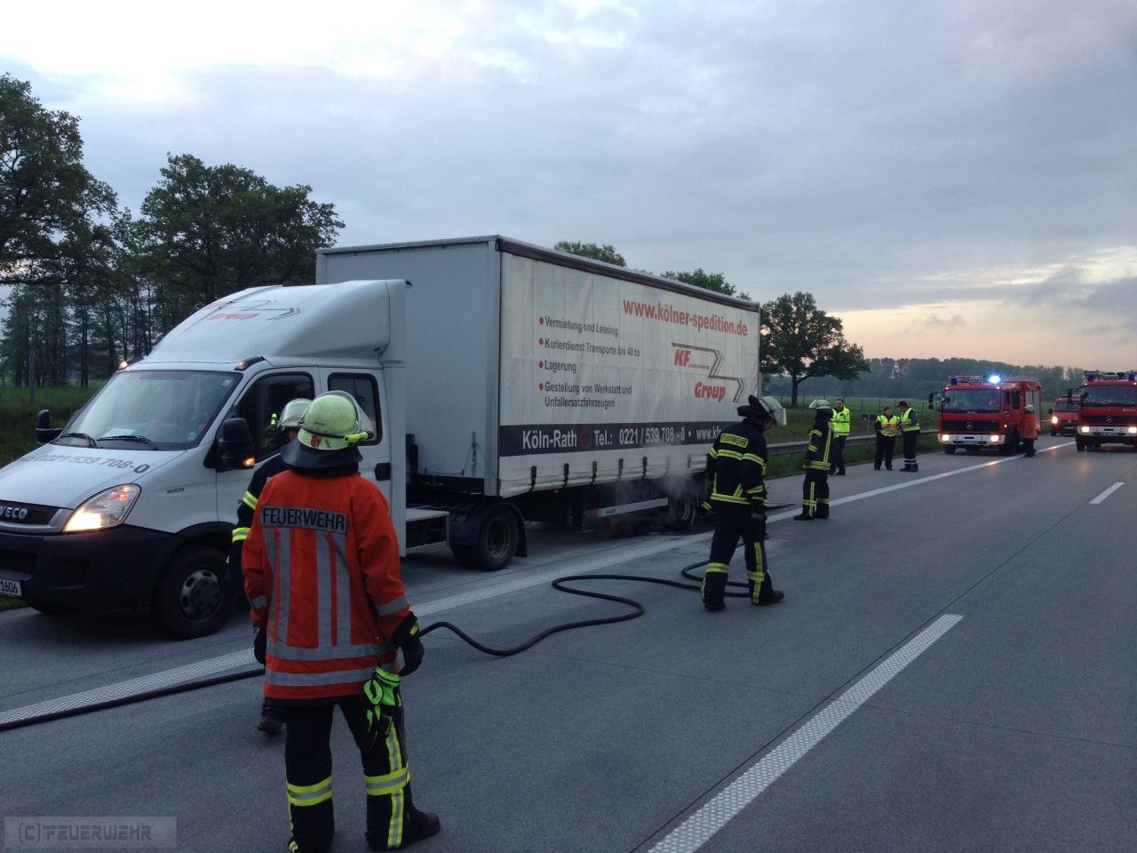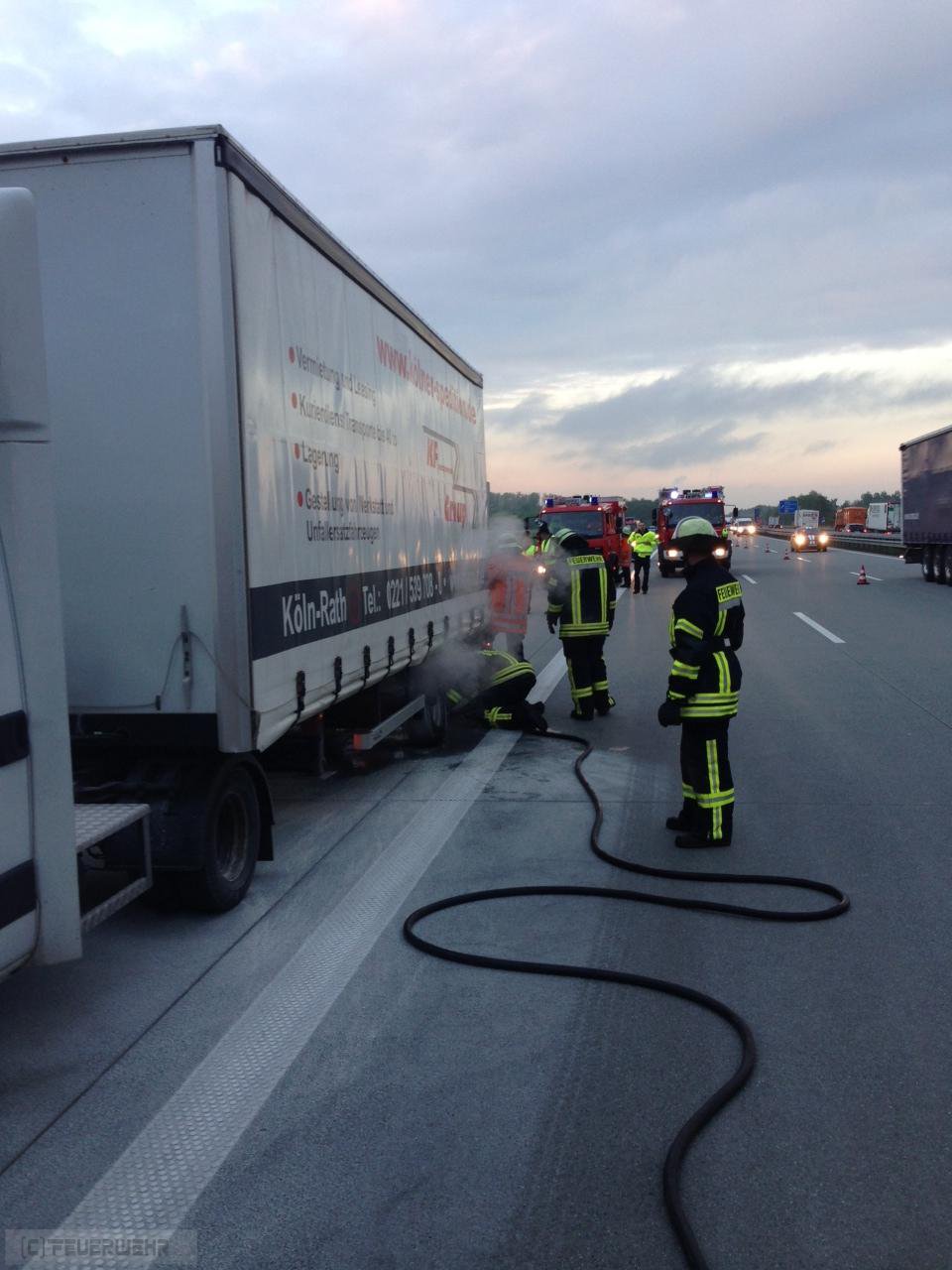 Bockel(tw) Alarm für die Ortsfeuerwehren aus Zeven und Gyhum am 27.05.13 um 20:49 Uhr,der Einsatzort war die Autobahn in Höhe AS Bockel bei Kilometer 73 sollte ein LKW brennen. Aufgrund einer gebrochenen Achsnabe sind die Bremsen eines Sattelaufliegers heiß gelaufen und fingen an zu brennen. Mit Hilfe eines Feuerlöschers konnte der Fahrer (selber Feuerwehrmann) die Flammen ersticken,hierdurch hat der Fahrer einen größeren Schaden verhindern,da die Ladung aus Lösungsmitteln und Spraydosen bestand.