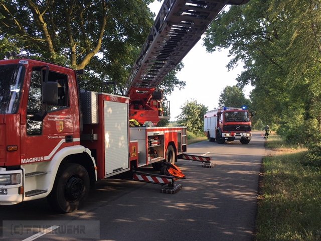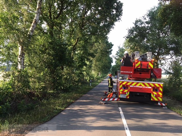 Es drohte ein größerer Ast auf die Straße zu fallen, mit Unterstützung der Drehleiter wurde die Gefahr beseitigt.